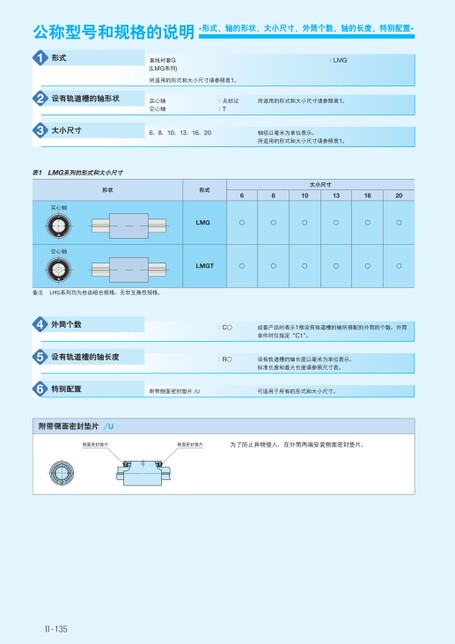 公称型号和规格的说明-形式、轴的形状、大小尺寸、外筒个数、轴的长度、特别配置-123形式直线衬套G(LMG系列)所适用的形式和大小尺寸请参照表1。:LMG设有轨道槽的轴形状实心轴空心轴:无标记:T所适用的形式和大小尺寸请参照表1。大小尺寸6、8、10、13、16、20轴径以毫米为单位表示。所适用的形式和大小尺寸请参照表1。表1LMG系列的形式和大小尺寸形状实心轴空心轴备注LMG系列均为自由组合规格。无非互换性规格。形式LMG6○8○大小尺寸10131620○○○○LMGT○○○○○○456外筒个数设有轨道槽的轴长度:C○:R○成套产品时表示1根设有轨道槽的轴所搭配的外筒的个数。外筒单件时仅指定“C1”。设有轨道槽的轴长度以毫米为单位表示。标准长度和最大长度请参照尺寸表。特别配置附带侧面密封垫片/U可适用于所有的形式和大小尺寸。附带侧面密封垫片/U侧面密封垫片侧面密封垫片为了防止异物侵入,在外筒两端安装侧面密封垫片。Ⅱ-135