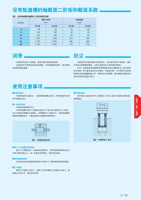 设有轨道槽的轴截面二阶矩和截面系数表5设有轨道槽的轴截面二阶矩和截面系数大小尺寸6810131620截面二阶矩mm4实心轴60190470136031307720空心轴59190460130029307230润滑断面系数mm3实心轴空心轴204995210390770204893200360720防尘LMG系列未封入润滑脂,请进行适当润滑后再使用。LMG系列可使用润滑油或润滑脂。采用润滑脂润滑时,建议使用优质锂皂基润滑脂。LMG系列没有安装防尘密封垫片,在非清洁环境下使用时,建议采用防尘罩等整体覆盖,以防止碎屑及灰尘等有害异物侵入。此外,虽有指定特别配置附带侧面密封垫片(辅助标记/U)可获得防尘效果,但大量垃圾或灰尘浮游时,或诸如切屑、沙尘等较大的异物粘附在设有轨道槽的轴上时,彻底防尘非常困难,因此推荐在直线运动部分安装防护盖进行防尘。使用注意事项外筒的配合外筒的安装外筒和轴承孔的配合,一般推荐间隙配合(H7)。特殊用途时也使将外筒压入轴承座中时,应使用压入夹具,通过冲压机等正确安装。用中间配合(J7)。一般安装结构外筒安装例如图1所示。外筒安装螺钉的拧入深度请勿超过尺寸表中所示的最大拧入深度。由于外筒的安装螺钉孔是通孔,如果螺纹拧入深度过长,设有轨道槽的轴将受到螺纹挤压,可能会影响行走精度和使用寿命。(参照图2)图1外筒的安装示例图2外筒的压入方法使几个外筒靠近后使用时使几个外筒靠近同一个轴承座后使用时,外筒间的距离推荐设定为外筒长度的3倍以上。进一步靠近后使用时,请向IKO咨询。承受旋转扭矩时在承受双向或反复旋转扭矩的工作条件下,请使用IKO滚珠花键G。工作温度最高工作温度为120℃,连续工作时的最高工作温度为100℃。温度超过100℃时,请向IKO咨询。Ⅱ-138