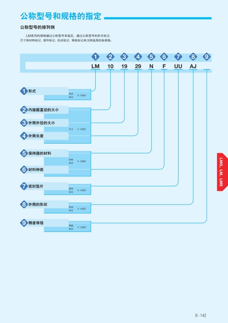 公称型号和规格的指定公称型号的排列例LM系列的规格通过公称型号来指定。通过公称型号的形式标记、尺寸和材料标记、部件标记、形状标记、等级标记来注明适用的各规格。1LM2103194295N6F7UU8AJ91形式形式标记Ⅱ-143页23456789内接圆直径的大小外筒外径的大小外筒长度保持器的材料材料种类密封垫片外筒的形状精度等级尺寸Ⅱ-143页材料标记Ⅱ-143页部件标记Ⅱ-143页形状标记Ⅱ-143页等级标记Ⅱ-143页Ⅱ-142