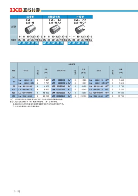 质量(参考)g16501610375072001160015700钢球列555566开放型6090110OP*6090110NOP*LMLMLM80120140LM100150175LM120180200LM150210240OP*OP*OP*OP*质量(参考)g17881757440085401490020150钢球列666688间隙调节型6090110AJ*6090110NAJ*LMLMLM80120140LM100150175LM120180200LM150210240AJ*AJ*AJ*AJ*质量(参考)g18171787452086001500020250钢球列666688轴径mm6080100120150标准型LMLMLM60901106090110N80120140*LM100150175*LM120180200*LM150210240*直线衬套标准型LMLM···N间隙调节型LM···AJLM···NAJ开放型LM···OPLM···NOP形状轴径6206082580103010012351201340150165062060825801030100123512013401501650-2060-25801030100123512013401501650公称型号用挡圈固定时的轮毂宽度为从C1的尺寸中减去2倍于挡圈宽度的值。注(1)备注1.尺寸公差及偏心的“精”栏表示精密级,“高”栏表示高级。2.轴径60mm的标准型和间隙调节型的侧板采用孔用止动环固定方式。3.公称型号末尾的*表示为准标准品。Ⅱ-149