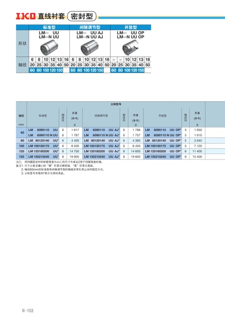 质量(参考)g16501610364071201140015400钢球列555566开放型LMLM6090110UUOP*6090110NUUOP*LM80120140UUOP*LM100150175UUOP*LM120180200UUOP*LM150210240UUOP*质量(参考)g17881757436084501460019800钢球列666688公称型号间隙调节型LMLM6090110UUAJ*6090110NUUAJ*LM80120140UUAJ*LM100150175UUAJ*LM120180200UUAJ*LM150210240UUAJ*质量(参考)g18171787440085001470019900钢球列666688轴径mm6080100120150标准型LM6090110UULM6090110NUULM80120140LM100150175LM120180200LM150210240UU*UU*UU*UU*直线衬套密封型标准型LM···UULM···NUU间隙调节型LM···UUAJLM···NUUAJ开放型LM···UUOPLM···NUUOP形状轴径6206082580103010012351201340150165062060825801030100123512013401501650-2060-25801030100123512013401501650用挡圈固定时的轮毂宽度为从C1的尺寸中减去2倍于挡圈宽度的值。注(1)备注1.尺寸公差及偏心的“精”栏表示精密级,“高”栏表示高级。2.轴径60mm的标准型和间隙调节型的侧板采用孔用止动环固定方式。3.公称型号末尾的*表示为准标准品。Ⅱ-153