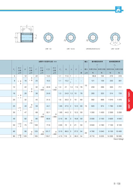 、、CADEαhhLME⋯UULME⋯UUAJLME80120165UUAJLME⋯UUOP主要尺寸及容许公差mm偏心基本额定动负荷基本额定静负荷尺寸公差μm0–2000–300尺寸公差μm0–2000–300C1(1)14.516.522.924.931.544.152.160.677.62.15592.65720–400101.7133.70–4003.1586.54.15116CC0最大负荷方向A负荷方向B负荷方向A负荷方向BμmN90.8C2D1hE1.11.111.5115.2-1--α度--1.3211.57.578121.324.91.510781.630.321060121259283562N104139298325N219255N310361503711514726668101014701.8537.5212.56015920974178022801.8544.5212.5501350143025003200333316.8502030215036204640172150394041807130912027.254204760504081501040036.3548710922014500185001N≈0.102kgfⅡ-158CC1C2C2FWD1D尺寸公差μm0–80–90–110–130–15C2225323645586880100125165D12162226324047627590尺寸公差μm80++–91+11–1+13–2+16–4120Fw58121620253040506080