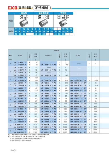 Ⅱ-161直线衬套不锈钢制公称型号轴径标准型钢球列质量(参考)间隙调节型钢球列质量(参考)开放型钢球列质量(参考)mmggg6LM61219F48------LM61219NF47.6LM61219NFAJ*47.58LM81517F413------LM81517NF410.4LM81517NFAJ*410LM81524F418------LM81524NF415LM81524NFAJ*414.710LM101929F433.8------LM101929NF426.8LM101929NFAJ*426.2LM101929NFOP*320.812LM122130F432.2LM122130FAJ*431.5LM122130FOP*325LM122130NF430.4LM122130NFAJ*429.7LM122130NFOP*324.513LM132332F443LM132332FAJ*442LM132332FOP*331LM132332NF442.5LM132332NFAJ*441.5LM132332NFOP*33116LM162837F470LM162837FAJ*469.5LM162837FOP*358LM162837NF469LM162837NFAJ*468LM162837NFOP*35220LM203242F592LM203242FAJ*591LM203242FOP*479LM203242NF587LM203242NFAJ*585LM203242NFOP*46925LM254059F6226LM254059FAJ*6222LM254059FOP*5203LM254059NF6220LM254059NFAJ*6216LM254059NFOP*518830LM304564F6253LM304564FAJ*6250LM304564FOP*5228LM304564NF6250LM304564NFAJ*6245LM304564NFOP*521035LM355270F6387LM355270FAJ*6380LM355270FOP*5355LM355270NF6380LM355270NFAJ*6375LM355270NFOP*533540LM406080F6596LM406080FAJ*6585LM406080FOP*5546LM406080NF6585LM406080NFAJ*6579LM406080NFOP*550050LM5080100F61615LM5080100FAJ*61595LM5080100FOP*51420LM5080100NF61580LM5080100NFAJ*61560LM5080100NFOP*5134060LM6090110F61817LM6090110FAJ*61788LM6090110FOP*51650LM6090110NF61787LM6090110NFAJ*61757LM6090110NFOP*516102.标准型和间隙调节型的侧板采用孔用止动环固定方式。备注1.尺寸公差及偏心的“精”栏表示精密级,“高”栏表示高级。注(1)3.公称型号末尾的*表示为准标准品。用挡圈固定时的轮毂宽度为从C1的尺寸中减去2倍于挡圈宽度的值。1230LM···F标准型LM···NF形状轴径40616508201335601025123040616508201335601025LM···FAJ间隙调节型LM···NFAJ12301640-13356010252050-开放型LM···FOPLM···NFOP