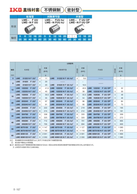Ⅱ-167直线衬套不锈钢制密封型公称型号轴径标准型钢球列质量(参考)间隙调节型钢球列质量(参考)开放型钢球列质量(参考)mmggg5LME51222NFUU*411LME51222NFUUAJ*49.5---8LME81625FUU*420------LME81625NFUU*420LME81625NFUUAJ*419.512LME122232FUU*441.5LME122232FUUAJ*440.5LME122232FUUOP*332LME122232NFUU*440LME122232NFUUAJ*439LME122232NFUUOP*33016LME162636FUU*456.5LME162636FUUAJ*455.5LME162636FUUOP*348LME162636NFUU*455LME162636NFUUAJ*454LME162636NFUUOP*34620LME203245FUU*597LME203245FUUAJ*596LME203245FUUOP*484LME203245NFUU*591LME203245NFUUAJ*590LME203245NFUUOP*47525LME254058FUU*6222LME254058FUUAJ*6219LME254058FUUOP*5195LME254058NFUU*(2)6215LME254058NFUUAJ*(2)6212LME254058NFUUOP*(2)518130LME304768FUU*6338LME304768FUUAJ*6333LME304768FUUOP*5309LME304768NFUU*6325LME304768NFUUAJ*6320LME304768NFUUOP*527240LME406280FUU*6712LME406280FUUAJ*6701LME406280FUUOP*5665LME406280NFUU*6705LME406280NFUUAJ*6694LME406280NFUUOP*560050LME5075100FUU*61147LME5075100FUUAJ*61127LME5075100FUUOP*51080LME5075100NFUU*61130LME5075100NFUUAJ*61110LME5075100NFUUOP*597060LME6090125FUU*62051LME6090125FUUAJ*62001LME6090125FUUOP*51900LME6090125NFUU*62050LME6090125NFUUAJ*62000LME6090125NFUUOP*515802.公称型号末尾的*表示为准标准品。(2)注(1)备注1.轴径8mm的不锈钢制保持器及轴径在12mm~60mm的标准型和间隙调节型的侧板采用孔用止动环固定方式。用挡圈固定时的轮毂宽度为从C1的尺寸中减去2倍于挡圈宽度的值。密封垫片略高出外筒侧面。165052583020601240标准型形状轴径LME···FUULME···NFUU165052583020601240间隙调节型LME···FUUAJLME···NFUUAJ16502060124025-30-开放型LME···FUUOPLME···NFUUOP