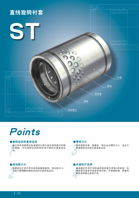 直线旋转衬套ST外筒钢球保持器侧板密封垫片Points●旋转运动和直线运动●惯性力小通过将具有圆筒状轨道面的外筒与装在保持器内的钢球搭配,可在旋转运动的同时进行轴向往复直线运动。保持器刚性高、重量轻,因此运动惯性力小,适合于高速旋转运动或往复直线运动。●滚动阻力小●丰富的产品群在精密加工的外筒内装有高精度钢球,滚动阻力小,可进行极顺畅的旋转运动和往复直线运动。备有额定负荷不同的通用型和重负荷型2种类型,各种类型均备有开放型和密封型。可根据机械、装置的规格选择最合适的产品。Ⅱ-175
