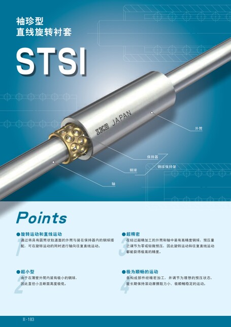 额定负荷和寿命袖珍型直线旋转衬套STSI外筒保持器钢球钢球保持架轴Points●旋转运动和直线运动●超精密通过将具有圆筒状轨道面的外筒与装在保持器内的钢球搭在经过超精加工的外筒和轴中装有高精度钢球,预压量配,可在旋转运动的同时进行轴向往复直线运动。已调节为零或轻微预压,因此旋转运动和往复直线运动都能获得极高的精度。●超小型●极为顺畅的运动由于在薄壁外筒内装有极小的钢球,各构成部件经精密加工,并调节为理想的预压状态,因此直径小且断面高度极低。能长期保持滚动摩擦阻力小、极顺畅稳定的运动。Ⅱ-183