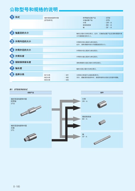 附带轴的成套产品无轴成套产品外筒钢球保持架轴:STSI:STS:OR…A:BK…A:SF…A轴径以毫米为单位表示。此外,无轴的成套产品及滚珠滑套时表示内接圆直径的大小。外筒的内径以毫米为单位表示。此外,滚珠滑套时表示外接圆直径的大小。外筒的外径以毫米为单位表示。外筒的长度以毫米为单位表示。滚珠滑套的长度以毫米为单位表示。轴的长度以毫米为单位表示。部件外筒OR⋯A钢球保持架BK⋯AF⋯A轴SM1分类M2分类M3分类:M1:M2:M3分类标记和容许公差如表3所示。另外,搭配使用各部件时,请使用相同分类标记的部件搭配。公称型号和规格的说明1形式袖珍型直线旋转衬套(STSI系列)2345678轴直径的大小外筒内径的大小外筒外径的大小外筒长度钢球保持架长度轴长度选择分类表1STSI系列的形式成套产品袖珍型直线旋转衬套附带轴STSI袖珍型直线旋转衬套无轴STSⅡ-185