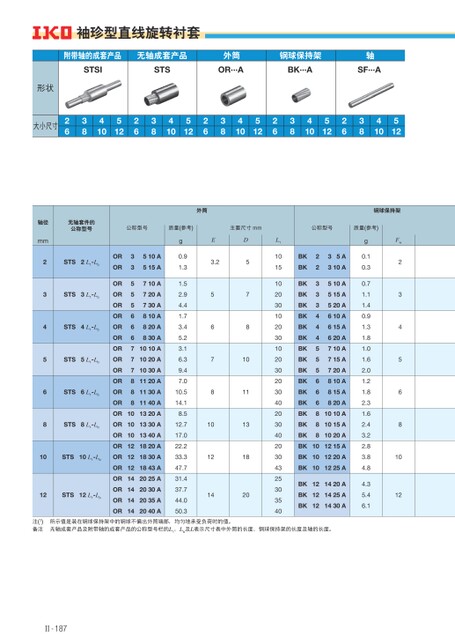 袖珍型直线旋转衬套附带轴的成套产品无轴成套产品STSISTS外筒OR···A钢球保持架BK···A轴SF···A形状大小尺寸26384105122638410512263841051226384105122638410512无轴套件的公称型号轴径mm234568STS2L1-LbOR3510AOR3515AOR5710ASTS3L1-LbOR5720AOR5730AOR6810ASTS4L1-LbOR6820AOR6830AOR71010ASTS5L1-LbOR71020AOR71030AOR81120ASTS6L1-LbOR81130AOR81140AOR101320ASTS8L1-LbOR101330AOR101340AOR121820A10STS10L1-LbOR121830A12STS12L1-LbOR121843AOR142025AOR142030AOR142035AOR142040A外筒钢球保持架公称型号质量(参考)主要尺寸mm公称型号质量(参考)E3.256781012D578101113181420g0.91.31.52.94.41.73.45.23.16.39.47.010.514.18.512.717.022.233.347.731.437.744.050.3L1101510203010203010203020304020304020304325303540BK235ABK2310ABK3510ABK3515ABK3520ABK4610ABK4615ABK4620ABK5710ABK5715ABK5720ABK6810ABK6815ABK6820ABK81010ABK81015ABK81020ABK101215ABK101220ABK101225ABK121420ABK121425ABK121430Ag0.10.30.71.11.40.91.31.81.01.62.01.21.82.31.62.43.22.83.84.84.35.46.1Fw2345681012注(1)备注所示值是装在钢球保持架中的钢球不偏出外筒端部,均匀地承受负荷时的值。无轴成套产品及附带轴的成套产品的公称型号栏的L1、Lb及L表示尺寸表中外筒的长度、钢球保持架的长度及轴的长度。Ⅱ-187