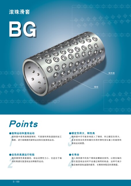 滚珠滑套BG保持器钢球Points●旋转运动和直线运动●额定负荷大、刚性高保持器中装有高精度钢球,可直接利用轨道面的加工保持器中尽可能多地装入了钢球,所以额定负荷大,精度,进行高精度的旋转运动和往复直线运动。是承受变动负荷和偏向负荷时弹性变位量小的高刚性直线运动装置。●出色的高速运行性能●长寿命保持器刚性高重量轻,故运动惯性力小,也适合于轴装入保持器中的各个钢球成螺旋状排列,以使在轴向向的高速往复直线运动等剧烈运动。的往复直线运动时不会通过相同的轨迹,这样可减少轴及轴承座轨道面的疲劳,长期保持稳定的高精度。Ⅱ-189