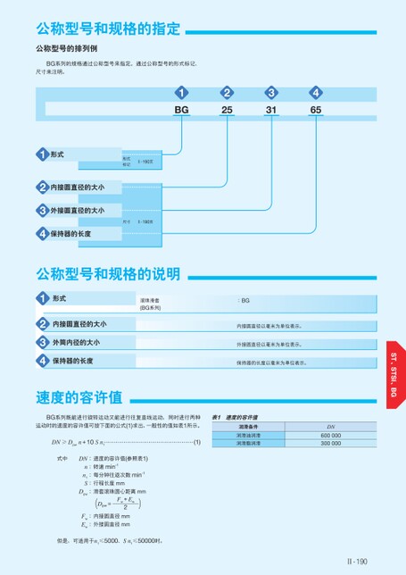 公称型号和规格的指定公称型号的排列例BG系列的规格通过公称型号来指定。通过公称型号的形式标记、尺寸来注明。1BG2253314651形式形式标记Ⅱ-190页234内接圆直径的大小外接圆直径的大小保持器的长度尺寸Ⅱ-190页公称型号和规格的说明1234形式内接圆直径的大小外筒内径的大小保持器的长度速度的容许值滚珠滑套(BG系列):BG内接圆直径以毫米为单位表示。外接圆直径以毫米为单位表示。保持器的长度以毫米为单位表示。BG系列既能进行旋转运动又能进行往复直线运动,同时进行两种表1速度的容许值运动时的速度的容许值可按下面的公式(1)求出,一般性的值如表1所示。DN≥Dpwn+10Sn1(1)润滑条件润滑油润滑润滑脂润滑DN600000300000式中DN:速度的容许值(参照表1)n:转速min-1n1:每分钟往返次数min-1S:行程长度mmDpw:滑套滚珠圆心距离mm(Dpw=Fw+Ew2)Fw:内接圆直径mmEw:外接圆直径mm但是,可适用于n1≤5000、Sn1≤50000时。Ⅱ-190