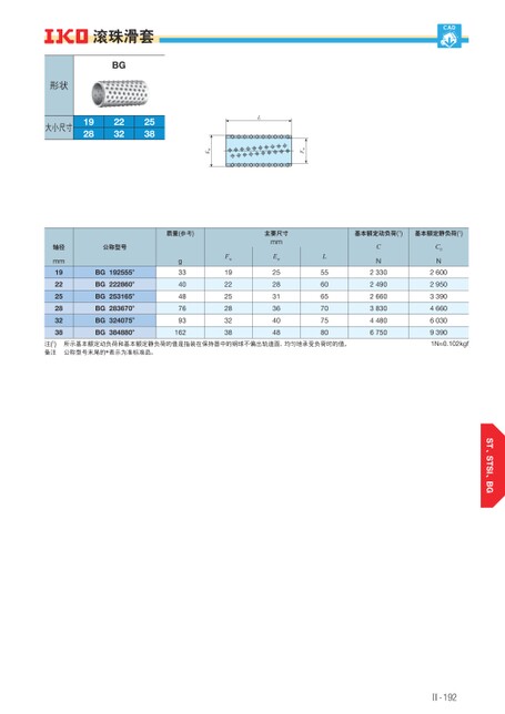 、、Ⅱ-192CADFwEw大小尺寸192822322538L滚珠滑套BG形状轴径mm192225283238公称型号BG192555*BG222860*BG253165*BG283670*BG324075*BG384880*质量(参考)主要尺寸mmg3340487693162Fw192225283238Ew252831364048L556065707580基本额定动负荷(1)基本额定静负荷(1)CN233024902660383044806750C0N260029503390466060309390注(1)备注所示基本额定动负荷和基本额定静负荷的值是指装在保持器中的钢球不偏出轨道面,均匀地承受负荷时的值。1N≈0.102kgf公称型号末尾的*表示为准标准品。