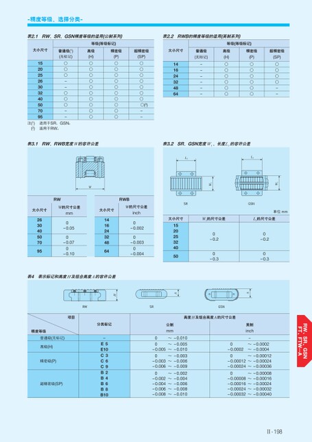 -精度等级、选择分类-表2.1RW、SR、GSN精度等级的适用(公制系列)表2.2RWB的精度等级的适用(英制系列)等级(等级标记)等级(等级标记)大小尺寸普通级(1)(无标记)高级(H)精密级(P)超精密级(SP)大小尺寸普通级(无标记)○-○○15202526303240507095适用于SR、GSN。适用于RW。○---○○注(1)(2)○○○○○○○○○○○○○○○○○○○○○○○○○○○○(2)--141624324864------高级(H)○○○○○○精密级(P)超精密级(SP)○○○○○○○○○○--表3.1RW、RWB宽度W的容许公差表3.2SR、GSN宽度W1、长度L1的容许公差L1GSN单位mmW1W1L1SR大小尺寸W1的尺寸公差L1的尺寸公差0–0.20–0.30–0.20–0.3WRWW的尺寸公差mm0–0.050–0.070–0.10大小尺寸263040507095RWB大小尺寸W的尺寸公差inch1416243248640–0.0020–0.0030–0.004表4表示标记和高度H及组合高度A的容许公差H152025324050AA英制inchⅡ-198–0.0002–0.0004–0.00012–0.00024–0.00036–0.00008–0.00016–0.00024–0.00032–0.00040-~~~~~~~~~~0–0.00020–0.00012–0.000240–0.00008–0.00016–0.00024–0.00032RWSRGSN高度H及组合高度A的尺寸公差公制mm–0.010–0.005–0.010–0.003–0.006–0.009–0.002–0.004–0.006–0.008–0.010~~~~~~~~~~~00–0.0050–0.003–0.0060–0.002–0.004–0.006–0.008精度等级普通级(无标记)高级(H)精密级(P)超精密级(SP)项目分类标记-E5E10C3C6C9B2B4B6B8B10