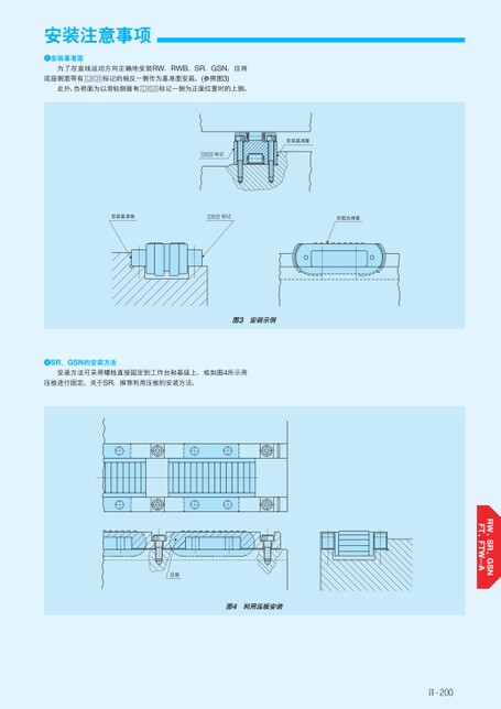 安装注意事项安装基准面为了在直线运动方向正确地安装RW、RWB、SR、GSN,应将底座侧面带有标记的相反一侧作为基准面安装。(参照图3)此外,负荷面为以滑轨侧面有标记一侧为正面位置时的上侧。安装基准面标记安装基准面标记负载负荷面图3安装示例SR、GSN的安装方法安装方法可采用螺栓直接固定到工作台和基座上,或如图4所示用压板进行固定。关于SR,推荐利用压板的安装方法。压板图4利用压板安装Ⅱ-200