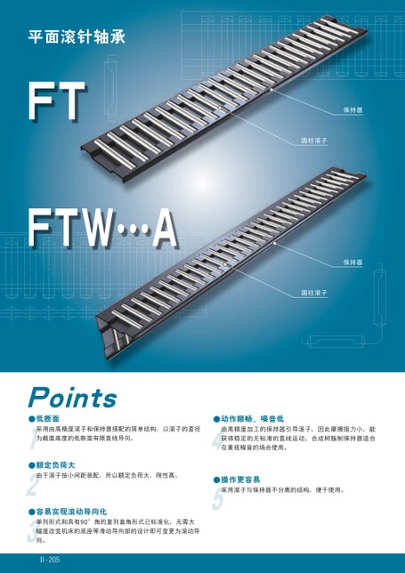 额定负荷和寿命平面滚针轴承FTFTW⋯A保持器圆柱滚子保持器圆柱滚子采用由高精度滚子和保持器搭配的简单结构,以滚子的直径由高精度加工的保持器引导滚子,因此摩擦阻力小,能为截面高度的低断面有限直线导向。获得稳定的无粘滑的直线运动。合成树脂制保持器适合●额定负荷大由于滚子按小间距装配,所以额定负荷大,刚性高。●操作更容易采用滚子与保持器不分离的结构,便于使用。●动作顺畅、噪音低在重视噪音的场合使用。45●容易实现滚动导向化单列形式和具有90°角的复列直角形式已标准化,无需大幅度改变机床的底座等滑动导向部的设计即可变更为滚动导ionts1P●低断面23向。Ⅱ-205