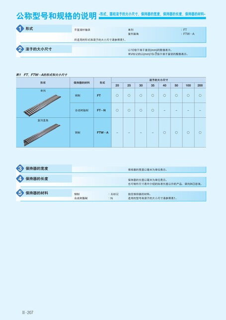 公称型号和规格的说明-形式、圆柱滚子的大小尺寸、保持器的宽度、保持器的长度、保持器的材料-12形式平面滚针轴承单列复列直角所适用的形式和滚子的大小尺寸请参照表1。:FTFTW…A:滚子的大小尺寸以10倍于滚子直径(mm)的数值表示。有V标记的以(mm)10√ ̄2倍于滚子直径的整数表示。表1FT、FTW…A的形式和大小尺寸形状单列复列直角保持器的材料形式202530354050100200滚子的大小尺寸钢制FT○○○○○○○○合成树脂制FT…N○○○○----钢制FTW…A----○○○○345保持器的宽度保持器的长度保持器的材料保持器的宽度以毫米为单位表示。保持器的长度以毫米为单位表示。也可制作尺寸表中介绍的标准长度以外的产品,请向IKO咨询。钢制合成树脂制:无标记:N指定保持器的材料。适用的型号和滚子的大小尺寸请参照表1。Ⅱ-207