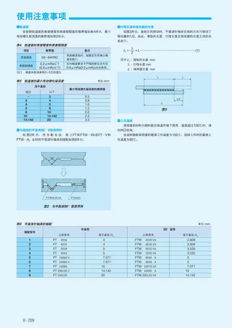 行程长度和保持器的长度如图3所示,直线方向移动时,平面滚针轴承在相同方向只移动了移动量的1/2。由此,滑轨的长度、行程长度及保持器的长度之间的关系如下。(1)式中L1:滑轨的长度mmS:行程长度mmL:保持器长度mm+LS2L1=LSS/2L1图3工作温度保持器的材料为钢时能在高温环境下使用,温度超过100℃时,请使用注意事项轨道面安装侧轨道面的表面硬度和表面粗糙度的推荐值如表4所示,最小有效硬化层深度的推荐值如表5所示。表4轨道面的表面硬度和表面粗糙度项目推荐值备注表面硬度58~64HRC表面粗糙度0.2μmRa以下(0.8μmRy以下)注(1)硬度系数请参照Ⅲ-5页的图3。表面硬度低时,给额定负荷乘以硬度系数(1)。在对精度要求不严格的部位也可在0.8μmRa(3.2μmRy)左右使用。表5轨道面的最小有效硬化层深度单位mm滚子直径超过-34581014.142以下34581014.14220最小有效硬化层深度的推荐值0.50.81.01.52.02.53.5与底座的平面成90°V面使用时向IKO咨询。如图2所示,完全配合后,装上FT和FTW…VA或FT…V和合成树脂制保持器的最高工作温度为100℃,连续工作时的最高工FTW…A。此时的平面滚针轴承的搭配如表6所示。作温度为80℃。90°FTW5035VAFT5043图2与平面成90°面使用例表6平面滚针轴承的搭配搭配型号平面用90°面用公称型号滚子直径Dw公称型号滚子直径Dw单位mm5035VA5035VA4030VA4030VAFTWFTWFTWFTWFTWFTWFTWFTWAFTW200120VA10070VA1009550455050AA2.8282.8283.5353.535557.0711014.1425043503840354030FTFTFTFTFTFTFTFT200100VFT20012010060V10060V1008044557.0717.0711014.14220123456789Ⅱ-209