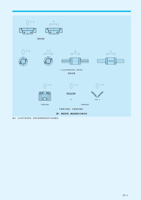 C、C0T0滚珠滑组C、C0T、T0TXTYC-Lube自润滑滚珠花键G、滚珠花键G滚珠花键C、C0C、C0C、C0FTFTW⋯A平面滚子轴承平面滚针轴承平面滚子轴承、平面滚针轴承图1额定负荷、额定扭矩及力矩方向备注交叉滚子直线导轨、直线衬套请参照各系列产品的解说。Ⅲ-4