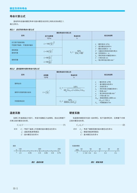 额定负荷和寿命寿命计算公式直线导向设备的额定寿命与基本额定动负荷之间的关系如表2.1、表2.2所示。表2.1各系列的寿命计算公式系列交叉滚子直线导轨平面滚子轴承、平面滚针轴承滚珠滑组直线衬套滚珠花键表2.2直线旋转衬套的寿命计算公式系列旋转运动总行走距离103mL=100(C—P)3—10L=50(C—P)3L=50(C—P)3L=50(T—M)3总转数106转旋转与往复的复合运动L=(C—P)3=Lh往复直线运动Lh=106L600Sn1/(πDPW)额定寿命的计算公式寿命时间hLh=106L2Sn1×60额定寿命的计算公式寿命时间h106L60(DPWn)2+(10Sn1)2/DPW标记的说明L:额定寿命103mC:基本额定动负荷NT:额定动扭矩N·mP:当量动负荷(或负载负荷)NM:负荷扭矩N·mLh:用时间表示的额定寿命hS:行程长度mmn1:每分钟往返次数min-1标记的说明:额定寿命106转:基本额定动负荷N:负载负荷NLCPLhnn1SDPW:滑套滚珠圆心距离mmFW:内接圆直径mm:用时间表示的额定寿命h:转速min-1:每分钟往返次数min-1:行程长度mm(DPW≈1.15FW)温度系数硬度系数如果工作温度超过150℃,则容许接触应力会降低,因此应根据下轨道面的硬度须为58~64HRC。低于58HRC时,应根据下式修式修正基本额定动负荷。Ct=ftC正基本额定动负荷。(1)CH=fHC(2)式中Ct:考虑了温度上升因素的基本额定动负荷Nft:温度系数(参照图2)C:基本额定动负荷N式中CH:考虑了硬度因素的基本额定动负荷NfH:硬度系数(参照图3)C:基本额定动负荷N温度℃ft1501.02002500.950.90.850.80.75轨道面硬度HRCfH605040302010.80.60.40.20.1图2温度系数图3硬度系数Ⅲ-5
