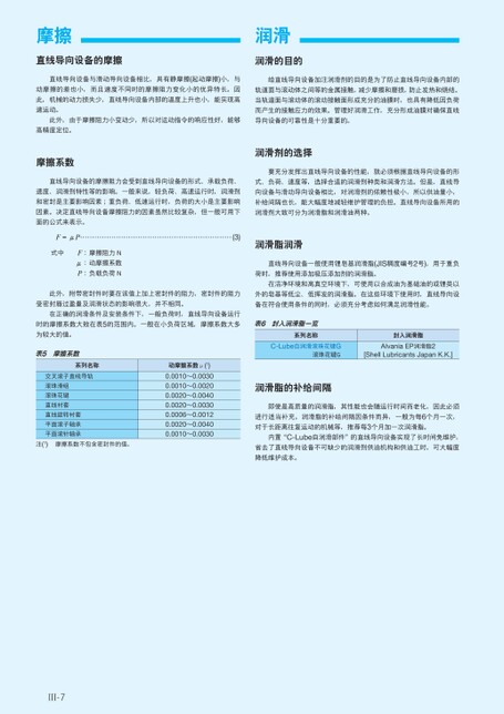 摩擦直线导向设备的摩擦润滑润滑的目的直线导向设备与滑动导向设备相比,具有静摩擦(起动摩擦)小,与动摩擦的差也小,而且速度不同时的摩擦阻力变化小的优异特长。因此,机械的动力损失少,直线导向设备内部的温度上升也小,能实现高速运动。给直线导向设备加注润滑剂的目的是为了防止直线导向设备内部的轨道面与滚动体之间等的金属接触,减少摩擦和磨损,防止发热和烧结。当轨道面与滚动体的滚动接触面形成充分的油膜时,也具有降低因负荷而产生的接触应力的效果。管理好润滑工作,充分形成油膜对确保直线此外,由于摩擦阻力小变动少,所以对运动指令的响应性好,能够导向设备的可靠性是十分重要的。高精度定位。摩擦系数润滑剂的选择直线导向设备的摩擦阻力会受到直线导向设备的形式、承载负荷、式、负荷、速度等,选择合适的润滑剂种类和润滑方法。但是,直线导速度、润滑剂特性等的影响。一般来说,轻负荷、高速运行时,润滑剂向设备与滑动导向设备相比,对润滑剂的依赖性极小,所以供油量小,和密封是主要影响因素;重负荷、低速运行时,负荷的大小是主要影响补给间隔也长,能大幅度地减轻维护管理的负担。直线导向设备所用的因素。决定直线导向设备摩擦阻力的因素虽然比较复杂,但一般可用下润滑剂大致可分为润滑脂和润滑油两种。要充分发挥出直线导向设备的性能,就必须根据直线导向设备的形面的公式来表示。F=μP式中F:摩擦阻力Nμ:动摩擦系数P:负载负荷N(3)润滑脂润滑直线导向设备一般使用锂皂基润滑脂(JIS稠度编号2号),用于重负荷时,推荐使用添加极压添加剂的润滑脂。在洁净环境和高真空环境下,可使用以合成油为基础油的或锂类以此外,附带密封件时要在该值上加上密封件的阻力,密封件的阻力外的皂基等低尘、低挥发的润滑脂。在这些环境下使用时,直线导向设受密封唇过盈量及润滑状态的影响很大,并不相同。备在符合使用条件的同时,必须充分考虑如何满足润滑性能。在正确的润滑条件及安装条件下,一般负荷时,直线导向设备运行时的摩擦系数大致在表5的范围内。一般在小负荷区域,摩擦系数大多为较大的值。表5摩擦系数系列名称交叉滚子直线导轨滚珠滑组滚珠花键直线衬套直线旋转衬套平面滚子轴承平面滚针轴承注(1)摩擦系数不包含密封件的值。动摩擦系数μ(1)0.0010~0.00300.0010~0.00200.0020~0.00400.0020~0.00300.0006~0.00120.0020~0.00400.0010~0.0030表6封入润滑脂一览系列名称封入润滑脂C-Lube自润滑滚珠花键G滚珠花键GAlvaniaEP润滑脂2[ShellLubricantsJapanK.K.]润滑脂的补给间隔即使是高质量的润滑脂,其性能也会随运行时间而老化,因此必须进行适当补充。润滑脂的补给间隔因条件而异,一般为每6个月一次,对于长距离往复运动的机械等,推荐每3个月加一次润滑脂。内置“C-Lube自润滑部件”的直线导向设备实现了长时间免维护,省去了直线导向设备不可缺少的润滑剂供油机构和供油工时,可大幅度降低维护成本。Ⅲ-7
