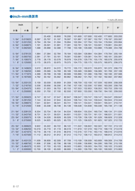 附表●inch-mm换算表1inch=25.4mminch分数小数1/64″1/32″3/64″1/16″00.0156250.0312500.0468750.0625005/64″3/32″7/64″1/8″0.0781250.0937500.1093750.1250009/64″5/32″11/64″3/16″0.1406250.1562500.1718750.18750013/64″7/32″15/64″1/4″0.2031250.2187500.2343750.25000017/64″9/32″19/64″5/16″0.2656250.2812500.2968750.31250021/64″11/32″23/64″3/8″0.3281250.3437500.3593750.37500025/64″13/32″27/64″7/16″0.3906250.4062500.4218750.43750029/64″15/32″31/64″1/2″0.4531250.4687500.4843750.5000000″1″2″3″4″5″6″7″8″0.3970.7941.1911.5881.9842.3812.7783.1753.5723.9694.3664.7625.1595.5565.9536.3506.7477.1447.5417.9388.3348.7319.1289.5259.92210.31910.71611.11211.50911.90612.30312.70025.40025.79726.19426.59126.98827.38427.78128.17828.57528.97229.36929.76630.16230.55930.95631.35331.75032.14732.54432.94133.33833.73434.13134.52834.92535.32235.71936.11636.51236.90937.30637.70338.10050.80051.19751.59451.99152.38852.78453.18153.57853.97554.37254.76955.16655.56255.95956.35656.75357.15057.54757.94458.34158.73859.13459.53159.92860.32560.72261.11961.51661.91262.30962.70663.10363.50076.20076.59776.99477.39177.78878.18478.58178.97879.37579.77280.16980.56680.96281.35981.75682.15382.55082.94783.34483.74184.13884.53484.93185.32885.72586.12286.51986.91687.31287.70988.10688.50388.900101.600101.997102.394102.791103.188127.000127.397127.794128.191128.588152.400152.797153.194153.591153.988177.800178.197178.594178.991179.388203.200203.597203.994204.391204.788103.584103.981104.378104.775128.984129.381129.778130.175154.384154.781155.178155.575179.784180.181180.578180.975205.184205.581205.978206.375105.172105.569105.966106.362130.572130.969131.366131.762155.972156.369156.766157.162181.372181.769182.166182.562206.772207.169207.566207.962106.759107.156107.553107.950132.159132.556132.953133.350157.559157.956158.353158.750182.959183.356183.753184.150208.359208.756209.153209.550108.347108.744109.141109.538133.747134.144134.541134.938159.147159.544159.941160.338184.547184.944185.341185.738209.947210.344210.741211.138109.934110.331110.728111.125135.334135.731136.128136.525160.734161.131161.528161.925186.134186.531186.928187.325211.534211.931212.328212.725111.522111.919112.316112.712136.922137.319137.716138.112162.322162.719163.116163.512187.722188.119188.516188.912213.122213.519213.916214.312113.109113.506113.903114.300138.509138.906139.303139.700163.909164.306164.703165.100189.309189.706190.103190.500214.709215.106215.503215.900Ⅳ-17