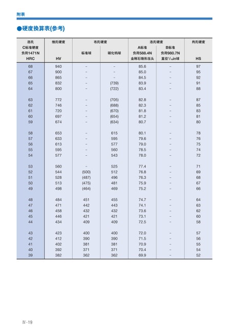 附表●硬度换算表(参考)维氏硬度布氏硬度洛氏硬度肖氏硬度标准球碳化钨球负荷588.4N金刚石锥形压头A标准B标准负荷980.7N直径1/16in球----------------(500)(487)(475)(464)451442432421409400390381371362---(739)(722)(705)(688)(670)(654)(634)61559557756054352551249648146945544343242140940039038137136285.685.084.583.983.482.882.381.881.280.780.179.679.078.578.077.476.876.375.975.274.774.173.673.172.572.071.570.970.469.9------------------------------HS979592918887858381807876757472716968676664636260585756555452HV940900865832800772746720697674653633613595577560544528513498484471458446434423412402392382洛氏C标准硬度负荷1471NHRC686766656463626160595857565554535251504948474645444342414039Ⅳ-19