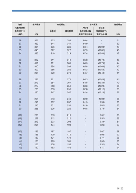 洛氏C标准硬度负荷1471NHRC38373635343332313029282726252423222120(18)(16)(14)(12)(10)(8)(6)(4)(2)(0)维氏硬度布氏硬度洛氏硬度肖氏硬度标准球碳化钨球负荷588.4N金刚石锥形压头A标准B标准负荷980.7N直径1/16in球35334433632731931130129428627927126425825324724323723122621921220319418717917116515815235334433632731931130129428627927126425825324724323723122621921220319418717917116515815269.468.968.467.967.466.866.365.865.364.764.363.863.362.862.462.061.561.060.5------------(109.0)(108.5)(108.0)(107.5)(107.0)(106.0)(105.5)(104.5)(104.0)(103.0)(102.5)(101.5)(101.0)100.099.098.597.896.795.593.992.390.789.587.185.583.581.7HV372363354345336327318310302294286279272266260254248243238230222213204196188180173166160HS5150494847464443424141403838373635353433323129282726252424Ⅳ-20