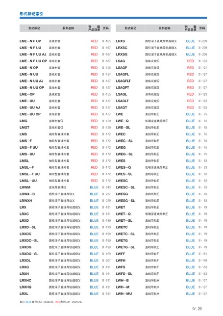 形式标记索引Ⅳ-26形式标记系列名称刊载产品目录页码LME…NFOP直线衬套REDⅡ-165LME…NFUU直线衬套REDⅡ-167LME…NFUUAJ直线衬套REDⅡ-167LME…NFUUOP直线衬套REDⅡ-167LME…NOP直线衬套REDⅡ-155LME…NUU直线衬套REDⅡ-157LME…NUUAJ直线衬套REDⅡ-157LME…NUUOP直线衬套REDⅡ-157LME…OP直线衬套REDⅡ-155LME…UU直线衬套REDⅡ-157LME…UUAJ直线衬套REDⅡ-157LME…UUOP直线衬套REDⅡ-157LMG直线衬套GREDⅡ-139LMGT直线衬套GREDⅡ-139LMS袖珍型直线衬套REDⅡ-172LMS…F袖珍型直线衬套REDⅡ-172LMS…FUU袖珍型直线衬套REDⅡ-172LMS…UU袖珍型直线衬套REDⅡ-172LMSL袖珍型直线衬套REDⅡ-172LMSL…F袖珍型直线衬套REDⅡ-172LMSL…FUU袖珍型直线衬套REDⅡ-172LMSL…UU袖珍型直线衬套REDⅡ-172LRWM直线导轨模组BLUEⅡ-243LRWX…B圆柱滚子直线导轨XBLUEⅡ-227LRWXH圆柱滚子直线导轨XBLUEⅡ-229LRX圆柱滚子直线导轨超级XBLUEⅡ-191LRXC圆柱滚子直线导轨超级XBLUEⅡ-191LRXD圆柱滚子直线导轨超级XBLUEⅡ-199LRXD…SL圆柱滚子直线导轨超级XBLUEⅡ-199LRXDC圆柱滚子直线导轨超级XBLUEⅡ-199LRXDC…SL圆柱滚子直线导轨超级XBLUEⅡ-199LRXDG圆柱滚子直线导轨超级XBLUEⅡ-199LRXDG…SL圆柱滚子直线导轨超级XBLUEⅡ-199LRXDL圆柱滚子直线导轨超级XBLUEⅡ-207LRXG圆柱滚子直线导轨超级XBLUEⅡ-191LRXH圆柱滚子直线导轨超级XBLUEⅡ-191LRXHC圆柱滚子直线导轨超级XBLUEⅡ-191LRXHG圆柱滚子直线导轨超级XBLUEⅡ-191LRXL圆柱滚子直线导轨超级XBLUEⅡ-197形式标记系列名称刊载产品目录页码LRXS圆柱滚子直线导轨超级XBLUEⅡ-209LRXSC圆柱滚子直线导轨超级XBLUEⅡ-209LRXSG圆柱滚子直线导轨超级XBLUEⅡ-209LSAG滚珠花键GREDⅡ-123LSAGF滚珠花键GREDⅡ-127LSAGFL滚珠花键GREDⅡ-127LSAGFLT滚珠花键GREDⅡ-127LSAGFT滚珠花键GREDⅡ-127LSAGL滚珠花键GREDⅡ-123LSAGLT滚珠花键GREDⅡ-123LSAGT滚珠花键GREDⅡ-123LWE直线导轨EBLUEⅡ-75LWE…Q低噪音直线导轨EBLUEⅡ-75LWE…SL直线导轨EBLUEⅡ-75LWEC直线导轨EBLUEⅡ-75LWEC…SL直线导轨EBLUEⅡ-75LWEG直线导轨EBLUEⅡ-75LWEG…SL直线导轨EBLUEⅡ-75LWES直线导轨EBLUEⅡ-83LWES…Q低噪音直线导轨EBLUEⅡ-83LWES…SL直线导轨EBLUEⅡ-83LWESC直线导轨EBLUEⅡ-83LWESC…SL直线导轨EBLUEⅡ-83LWESG直线导轨EBLUEⅡ-83LWESG…SL直线导轨EBLUEⅡ-83LWET直线导轨EBLUEⅡ-79LWET…Q低噪音直线导轨EBLUEⅡ-79LWET…SL直线导轨EBLUEⅡ-79LWETC直线导轨EBLUEⅡ-79LWETC…SL直线导轨EBLUEⅡ-79LWETG直线导轨EBLUEⅡ-79LWETG…SL直线导轨EBLUEⅡ-79LWFF直线导轨FBLUEⅡ-151LWFH直线导轨FBLUEⅡ-149LWFS直线导轨FBLUEⅡ-153LWFS…SL直线导轨FBLUEⅡ-153LWH…B直线导轨HBLUEⅡ-107LWH…M直线导轨HBLUEⅡ-107LWH…MU直线导轨HBLUEⅡ-107备注BLUE表示CAT-1604CN、RED表示CAT-1605CN。