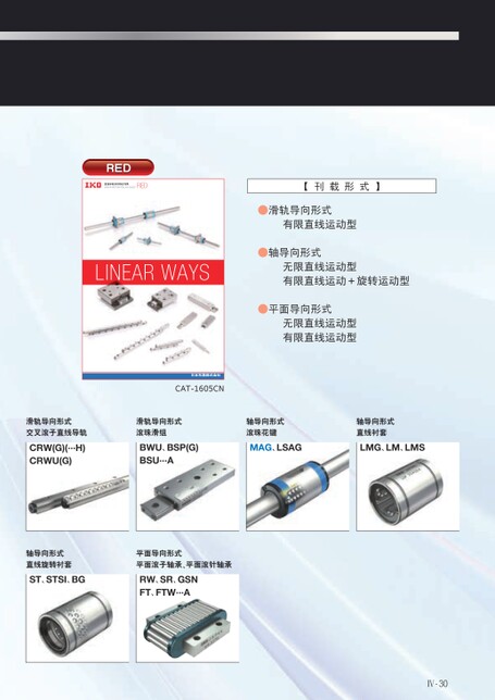Ⅳ-30【刊载形式】●滑轨导向形式有限直线运动型●轴导向形式无限直线运动型有限直线运动+旋转运动型●平面导向形式无限直线运动型有限直线运动型LINEARWAYSLIEARMOTINROLLINGGUIDEREDREDREDLINEARMOTIONROLLINGGUIEREDCAT-1588CNPritediChina©2021.09(KA)CAT-1605CN滑轨导向形式交叉滚子直线导轨CRW(G)(···H)CRWU(G)滑轨导向形式滚珠滑组BWU、BSP(G)BSU···A轴导向形式滚珠花键MAG、LSAG轴导向形式直线衬套LMG、LM、LMS轴导向形式直线旋转衬套ST、STSI、BG平面导向形式平面滚子轴承、平面滚针轴承RW、SR、GSNFT、FTW···A