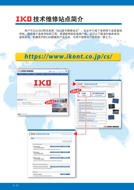 技术维修站点简介用户可以从IKO网页利用“IKO技术维修站点”。站点中介绍了各种用于选择直线导轨、圆柱滚子直线导轨的工具,希望能帮助您选择产品。还可以下载滚针轴承系列、直线系列、机械系列的CAD数据和产品目录,为用户提高设计效率助一臂之力。Ⅳ-31