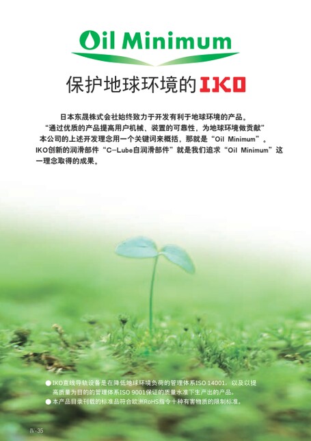 保护地球环境的日本东晟株式会社始终致力于开发有利于地球环境的产品。“通过优质的产品提高用户机械、装置的可靠性,为地球环境做贡献”本公司的上述开发理念用一个关键词来概括,那就是“OilMinimum”。IKO创新的润滑部件“C-Lube自润滑部件”就是我们追求“OilMinimum”这一理念取得的成果。●●IKO直线导轨设备是在降低地球环境负荷的管理体系ISO14001,以及以提高质量为目的的管理体系ISO9001保证的质量水准下生产出的产品。本产品目录刊载的标准品符合欧洲RoHS指令十种有害物质的限制标准。Ⅳ-35