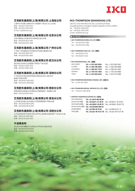 艾克欧东晟商贸(上海)有限公司上海总公司上海市长宁区娄山关路555号长房国际广场2301-02,2310室电话:+86(0)21-3250-5525传真:+86(0)21-3250-5526E-mail:ntc@ikonet.co.jp艾克欧东晟商贸(上海)有限公司北京分公司北京市朝阳区光华路4号东方梅地亚C座1909室电话:+86(0)10-6515-7681传真:+86(0)10-6515-7689艾克欧东晟商贸(上海)有限公司广州分公司广东省广州市越秀区环市东路368号花园大厦8楼834室电话:+86(0)20-8384-0797传真:+86(0)20-8381-2863艾克欧东晟商贸(上海)有限公司武汉分公司湖北省武汉市硚口区武胜路72号泰合广场2300室电话:+86(0)27-8556-1610传真:+86(0)27-8556-1630艾克欧东晟商贸(上海)有限公司深圳分公司广东省深圳市宝安区新安街道灵芝园社区创业二路188号勤诚达大厦1808室电话:+86(0)755-2265-0553传真:+86(0)755-2298-0665艾克欧东晟商贸(上海)有限公司西安分公司陕西省西安市新城区长乐西路166号朝阳国际广场B幢2010室电话:+86(0)29-8323-5915艾克欧东晟商贸(上海)有限公司青岛分公司山东省青岛市嶗山区深圳路101号青鉄華潤城47号楼608室电话:+86(0)532-8670-2246传真:+86(0)532-8670-2242艾克欧东晟商贸(上海)有限公司沈阳分公司辽宁省沈阳市和平区南京北街206号中山皇冠假日酒店城市广场C座1203室电话:+860)24-2334-2662传真:+860)24-2334-2442宁波事务所浙江省宁波市海曙区中山东路181号中农信大厦3406室电话:+86(0)574-8718-9535传真:+86(0)574-8718-9533IKO-THOMPSON(SHANGHAI)LTD.2301-02,2310,MetroPlazaNo.555,LouShanGuanRoad,ChangNingDistrict,Shanghai,People�sRepublicofChina,200051:+86(0)21-3250-5525Tel:+86(0)21-3250-5526FaxE-mail:ntc@ikonet.co.jp●海外事务所■IKOTHOMPSONKOREACO.,LTD(韩国)TelFax:+82(0)2-6337-5851:+82(0)2-6337-5852■IKOTHOMPSONASIACO.,LTD.(泰国)TelFax:+66(0)2637-5115:+66(0)2637-5116■IKOINTERNATIONAL,INC.(美国)NEWJERSEYILLINOISCALIFORNIAGEORGIATEXASTel.+1-973-402-0254Tel.+1-630-766-6464Tel.+1-562-941-1019Tel.+1-770-418-1904Tel.+1-972-925-0444:::::Fax.+1-973-402-0441Fax.+1-630-766-6869Fax.+1-562-941-4027Fax.+1-770-418-9403Fax.+1-972-707-0385■IKOTHOMPSONBEARINGSCANADA,INC.(加拿大)Tel:+1-647-931-3933■IKOTHOMPSONBRAZILSERVICECO.,LTD.(巴西)Tel:+55(0)11-2366-3033■NIPPONTHOMPSONEUROPEB.V.(欧洲)ROTTERDAM(荷兰)DÜSSELDORF(德国)REGENSBURG(德国)MILTONKEYNES(英国):Tel.+44(0)1908-566144MADRID(西班牙)PARIS(法国)Tel.+31(0)10-4626868Tel.+49(0)211-414061Tel.+49(0)941-206070Tel.+34949-263390Tel.+33(0)1-48165739:::::Fax.+49(0)211-427693Fax.+49(0)941-2060719Fax.+34949-263113Fax.+33(0)1-48165746Ⅳ-36
